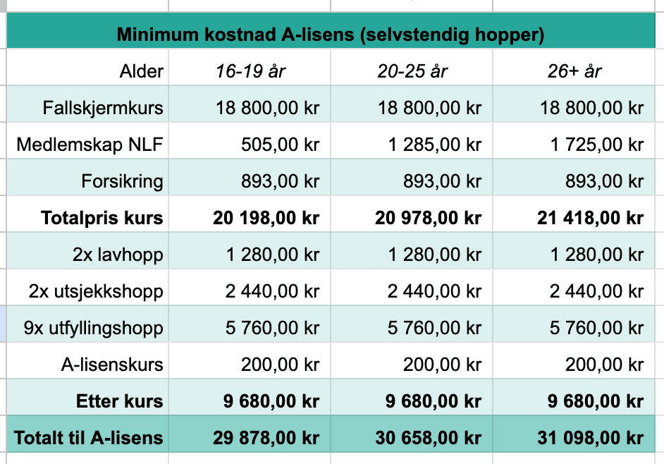 Kostnaden for å oppnå A-lisensen er omtrent 8 500 kr i tillegg til prisen på fallskjermkurset.